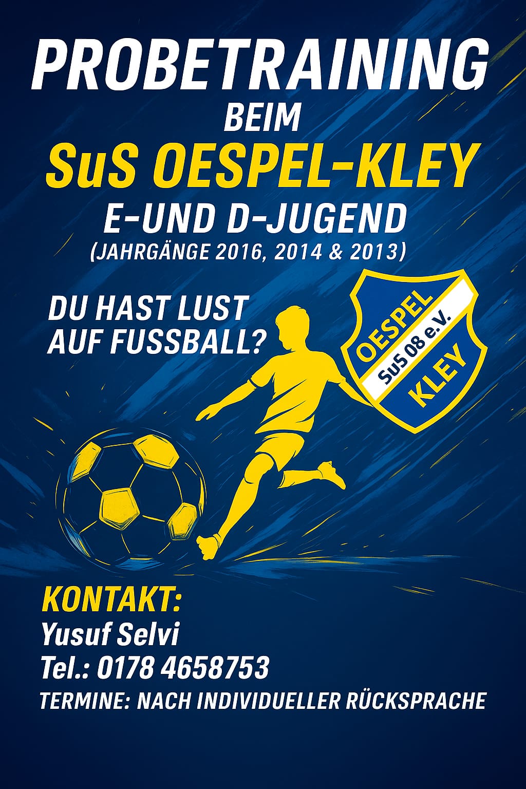 Der SuS Oespel-Kley ist ein Stadtteilverein im Südwesten Dortmunds. Wir verbinden Tradition und Nachwuchs, Ehrgeiz und Spaß. Die Gemeinschaft steht bei uns im Mittelpunkt. Neue Spielerinnen und Spieler sind bei uns jederzeit herzlich willkommen. Wenn Ihr Interesse an einem Probetraining habt, dann meldet Euch beim Jugendvorstand oder direkt bei den Trainerinnen und Trainern der Teams Eurer Altersklasse.
